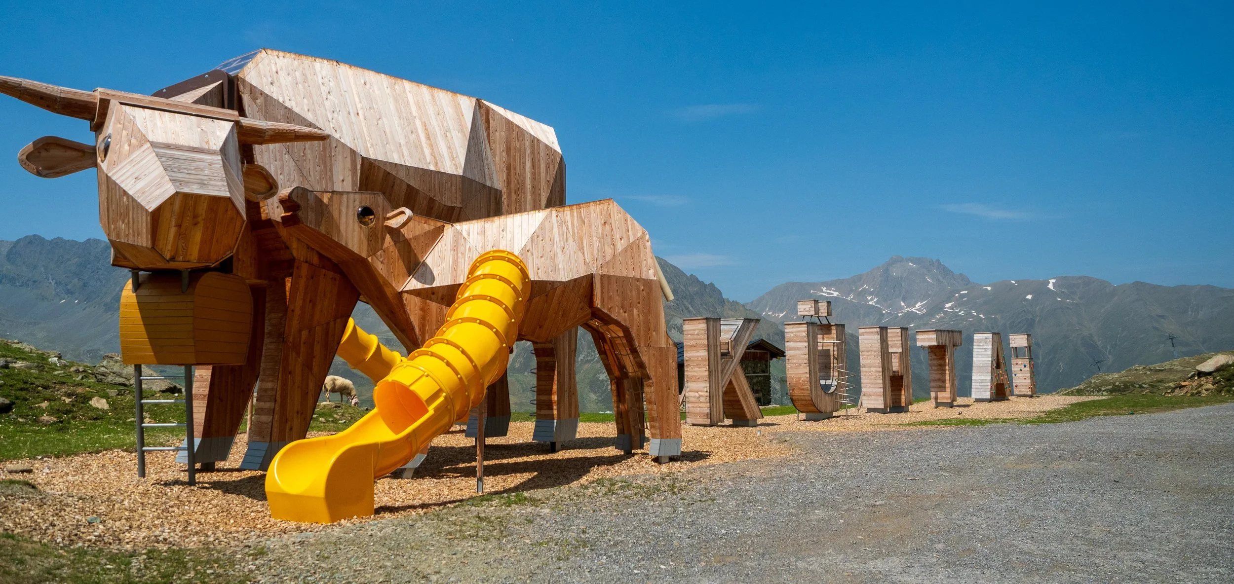 As you ascend, you’ll reach a plateau where the ski slope path meets access roads that criss-cross the area. These lead you to the Drei-Seen-Hütte, a mountain hut offering refreshments and a great place to pause. Nearby is a unique Kühtai sign that doubles as a sculpture and playground – a fun photo opportunity for all ages.